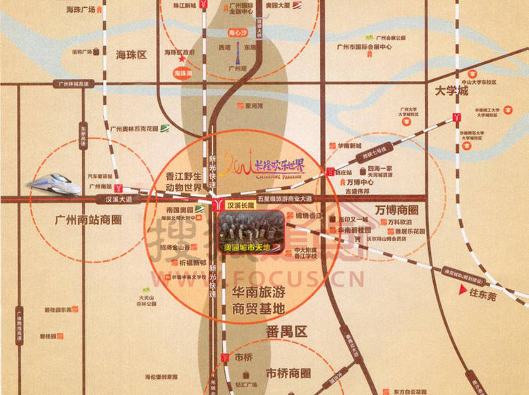 奥园城市天地处于广州新城市中轴线(天河城一珠江新城--番禺新城)核心商圈长隆-汉溪-万博板块,是广州打造的新城市中心,位于新光快速与汉溪大道交汇处,属地铁3号线、7号线上盖物业,交通四通八达。
