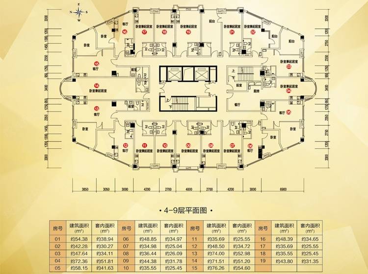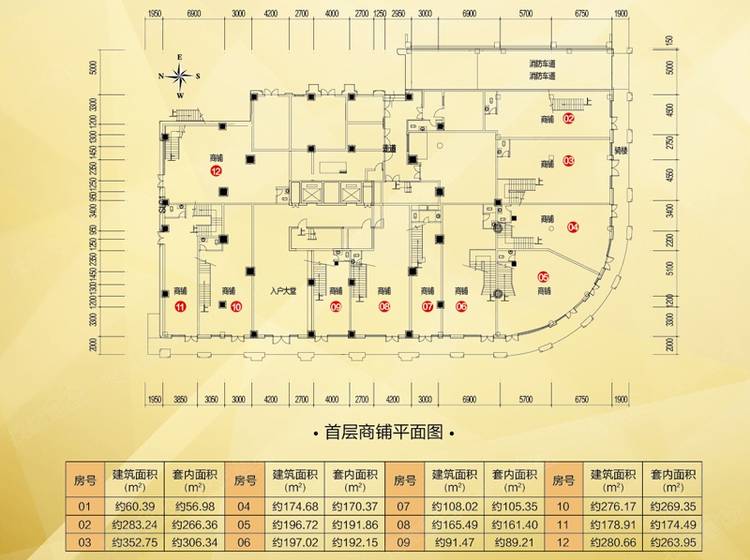1-2层为非餐饮商铺。建筑面积约60-326㎡的一线临街商铺,共12套。除建筑面积约60㎡(1套)外,其他均为双层铺。3-13层为小面积住宅,3米层高,建筑面积约34-76㎡的套间及一房一厅个性化户型,总共185套。