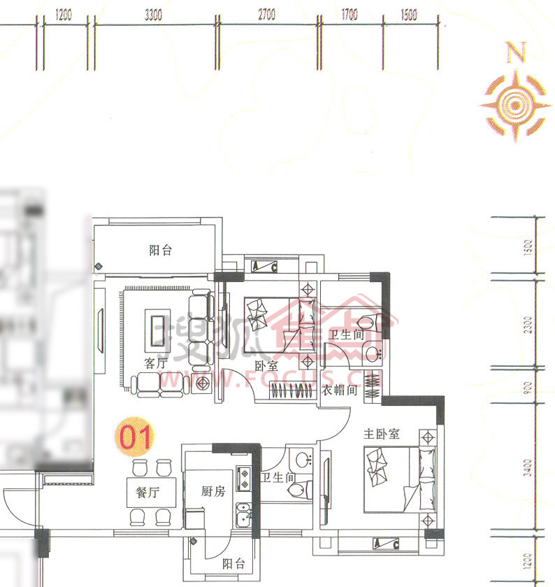 2室2厅2卫-1栋2-7层标准层01单元户型图