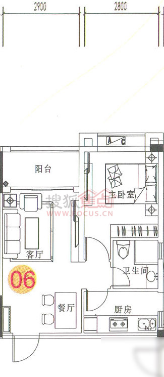 1室2厅1卫-2栋2-8层标准层06单元户型图