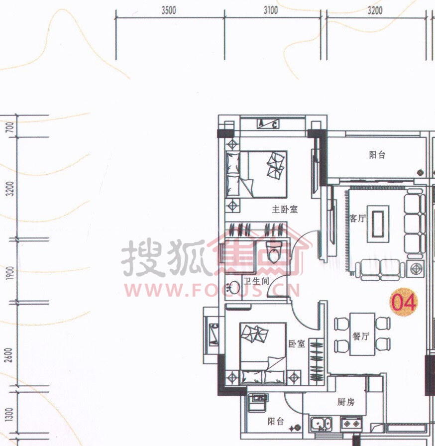 2室2厅1卫-1栋2-7层标准层04单元户型图
