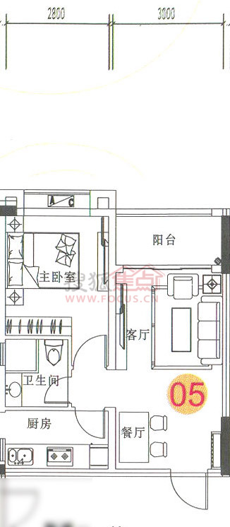 1室2厅1卫-1栋2-7层标准层05单元户型图