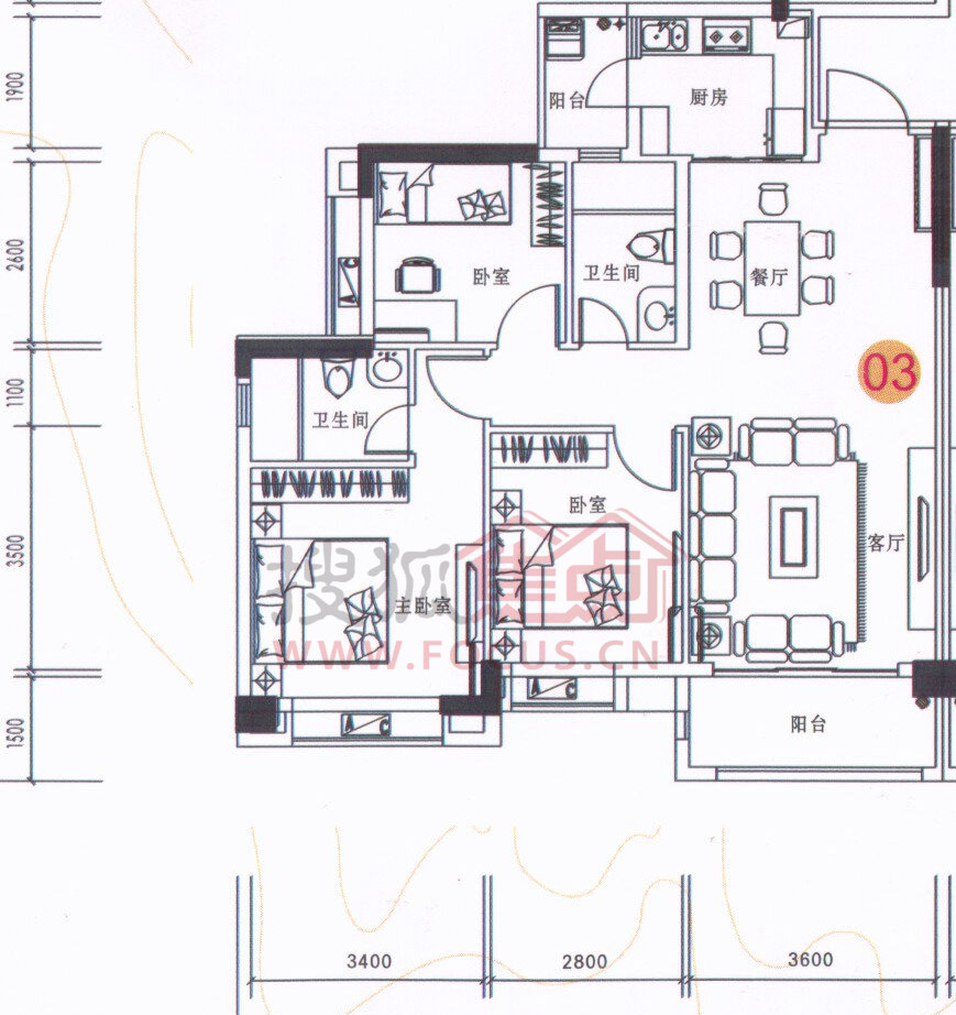 3室2厅2卫-1栋2-7层标准层03单元户型图