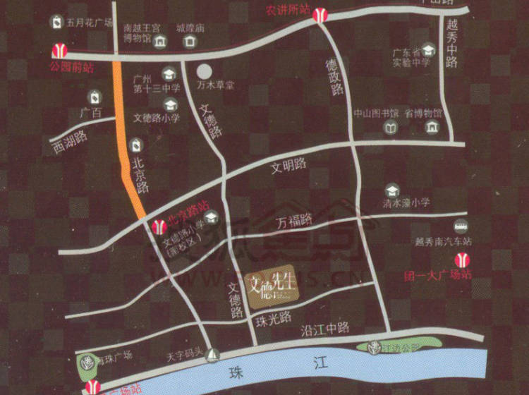 天河方向:珠江新城向正西方向出发——直行进入寺右新马路——右转进入达道路——左转进入中山一路——朝内环路(B线)/海印桥/东晓南路/江湾大桥方向,靠左进入内环路——从八旗二马路/沿江中路出口离开靠右——行驶170米,右转进入东华南路——直行进入八旗二马路——右转进入文德南路——右转进入珠光路——行驶40米——文德先生