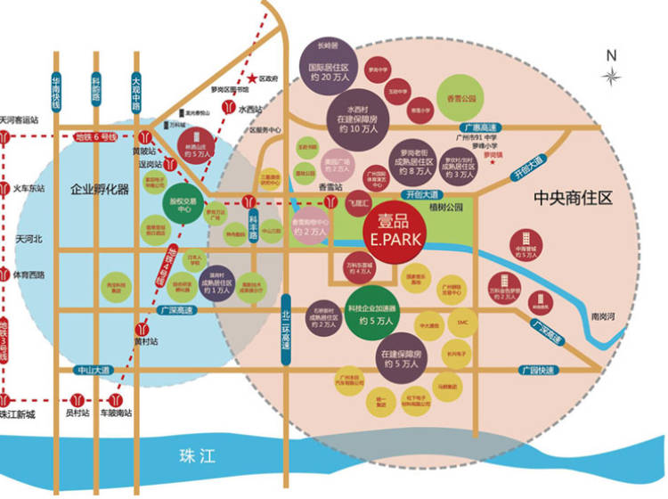 壹品E·PARK定位为中国互动式国际商务平台。项目位于南中国具有发展潜力的科技产业新城——广州科学城。处于科学城东部居住文化核心区域交通四通八达。东靠90万㎡植树公园,南承国家音乐基地,西临广州东部"莱茵河"—南岗河,北接100万㎡机务段大型住宅项目。整个项目背山面水,拥有优质的生态资源景观。