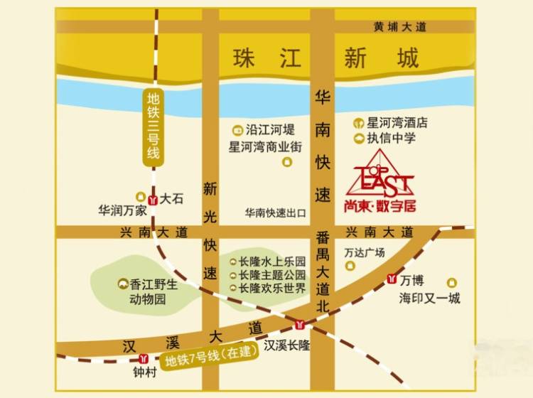 天河方向:珠江新城——向正东方向出发,朝冼村路/猎德大道/马场路/图书馆方向,靠左——朝猎德大桥/新光快速方向,右转进入猎德大道——进入华南快速——在土华立交桥靠左——在番禺大桥靠左——靠右行驶730米,右转——行驶70米,右转——行驶560米到达尚东数字居