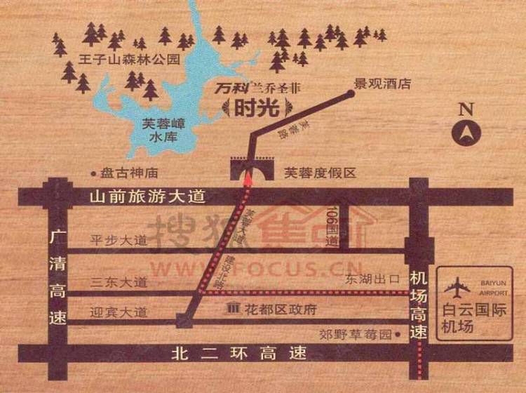 万科兰乔圣菲位于广州市花都区山前大道省级旅游度假区-芙蓉嶂度假区内,占地20万平米,建筑面积14万平米,容积率0.43,由512-1200平米独立别墅和250平米叠加别墅组成。由广清高速狮岭出口沿山前大道或走机场高速太成出口、沿建设北路、芙蓉大道都可进入项目