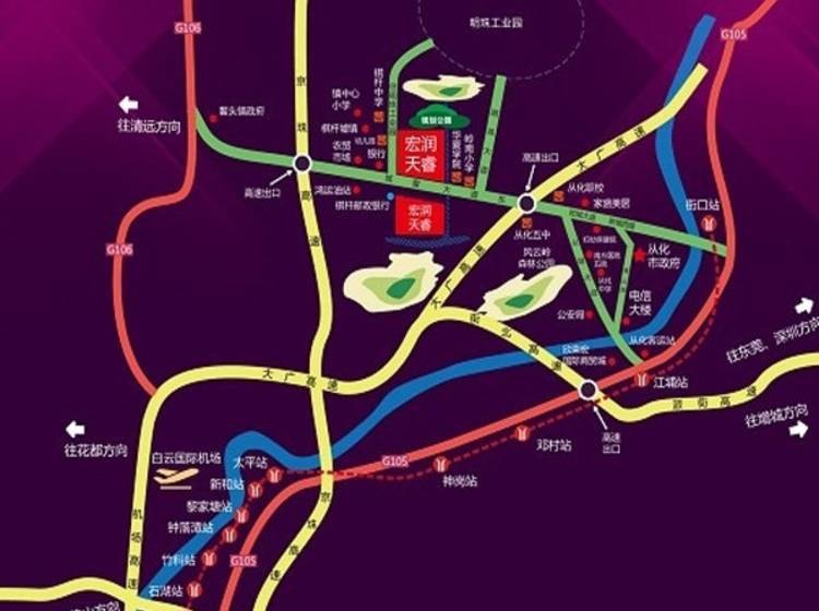 从天河出发,沿华南快速前行55.9公里进入S355线,行驶4.9公里左转进入幸福大道,前行即到达宏润天睿。