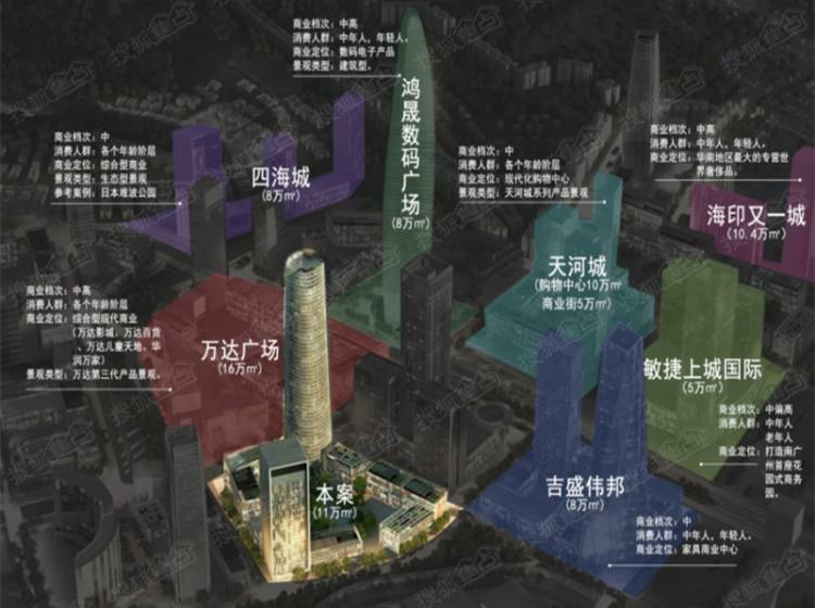 商业:有档次较高的海印又一城奢侈品折扣店和沃尔玛山姆会员店,也有中高等档次的天河城百货奥特莱斯商场、万达广场,以及在建的万博中心、天河城等大型商业中心