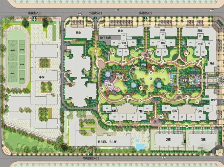 学校:幼儿园(20班)、托儿所、小学(36班)等公建配套。