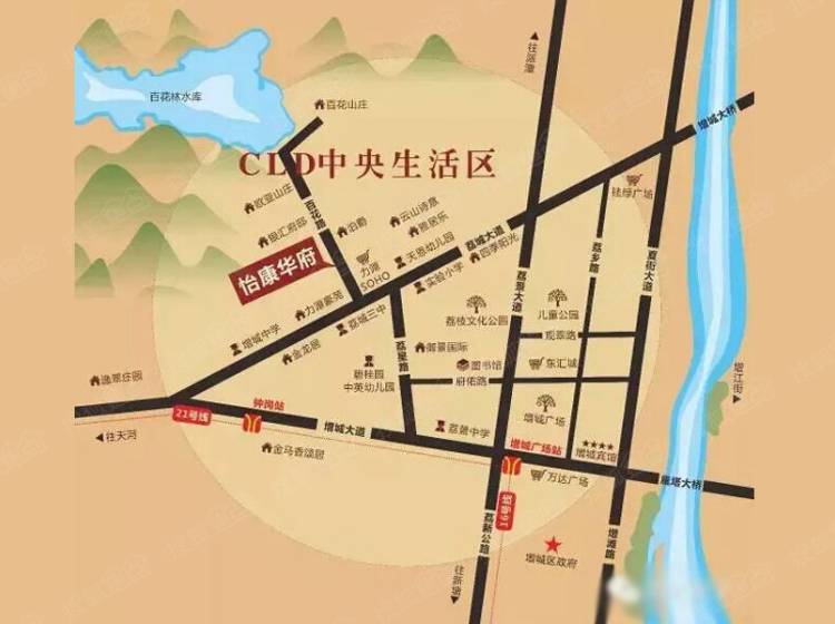 休闲娱乐设施:增城科技博物馆、增城图书馆、增城广播电视中心、增城公安局、增城广场