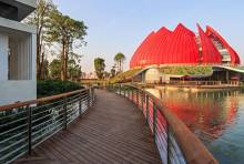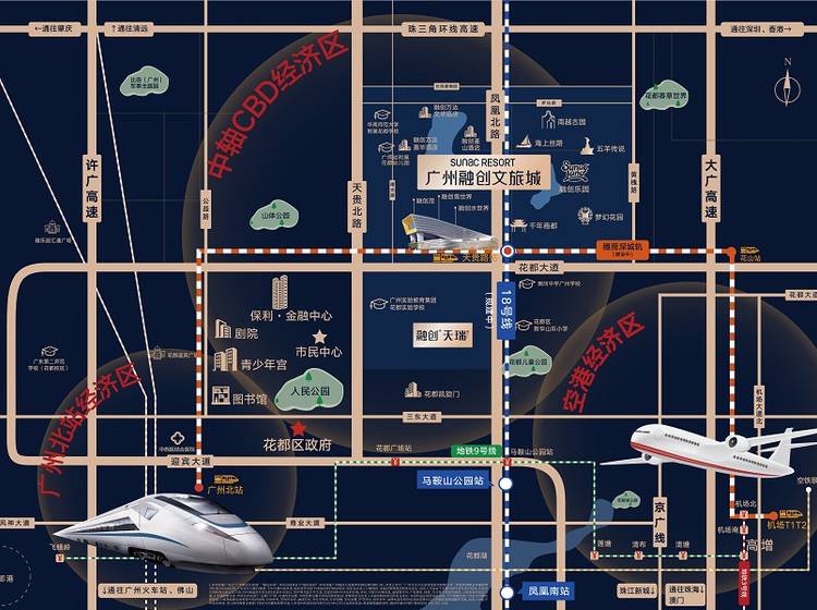 广州融创文旅城位于花都CBD中轴线上,项目总用地面积约2400亩,建有融创乐园、融创茂、雪世界、水世界、体育世界、高端酒店群、融创广州大剧院及滨湖酒吧街八大文化旅游业态,已于2019年6月15日盛大开业。