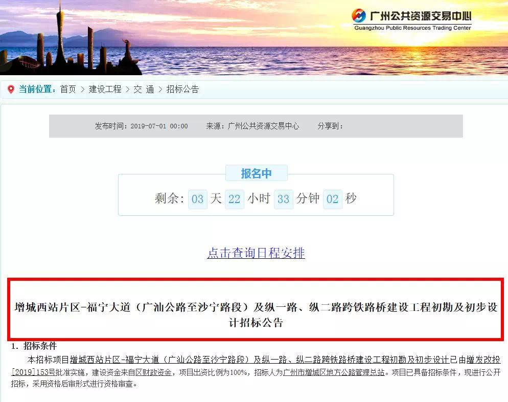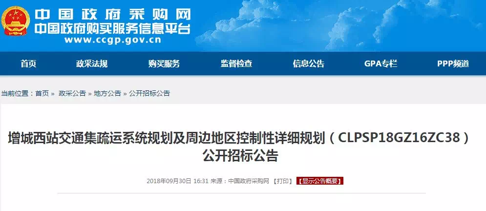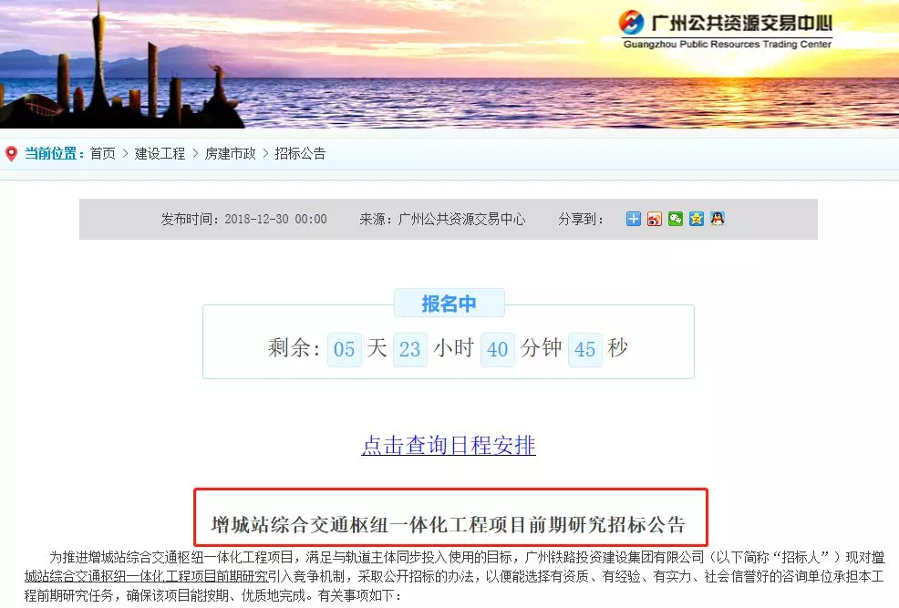 另外,在2018年12月30日,广州公共资源交易中心贴出了一则关于增城站综合交通枢纽一体化工程项目前期研究报告招标公告。