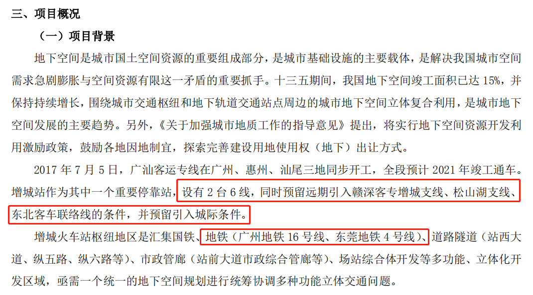 招标文件上描述到,2017 年 7 月 5 日,广汕客运专线在广州、惠州、汕尾三地同步开工,全段预计 2023 年竣工通车。增城站作为其中一个重要停靠站,设有 2 台 6 线,同时预留远期引入赣深客专增城支线、松山湖支线、东北客车联络线的条件,并预留引入城际条件。(也就是之前招标提及到的深莞增城际铁路)。