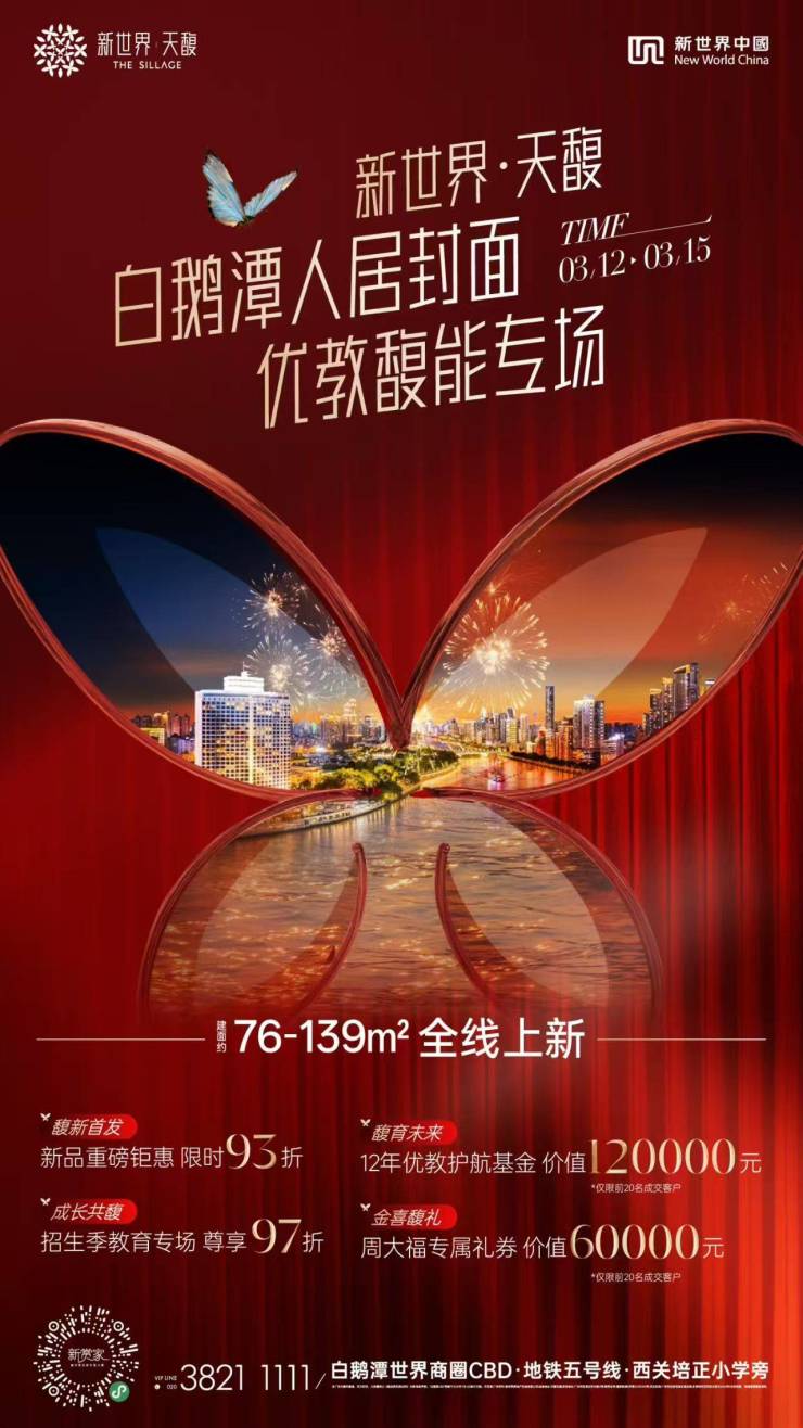 目前,项目建面约76-139㎡全线新品正火热推新,并重磅启动「优教馥能专场」:限时尊享93折、VIP专场97折,更有价值120000元的“12年优教护航基金”与价值60000元的“周大福专属礼券”倾情相赠。
