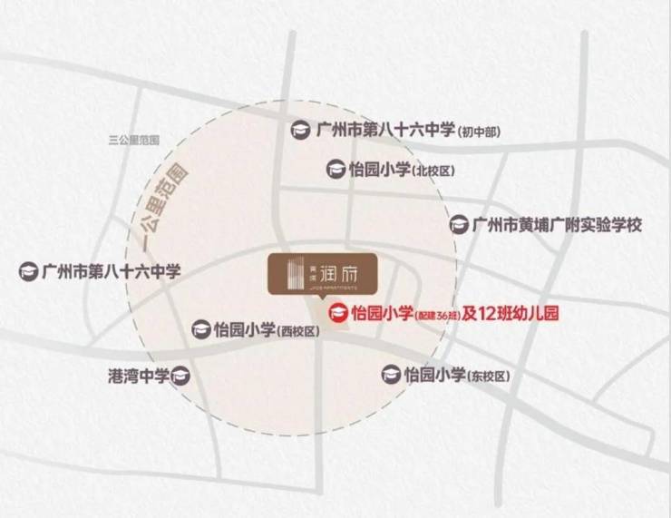 除了签约怡园小学,黄埔润府身边聚集的教育配套也足够密集:2公里内,黄埔广附实验学校、广州市第八十六中学等多所口碑中小学密集分布,筑就一条从幼儿园到初中的“全龄教育链路”。