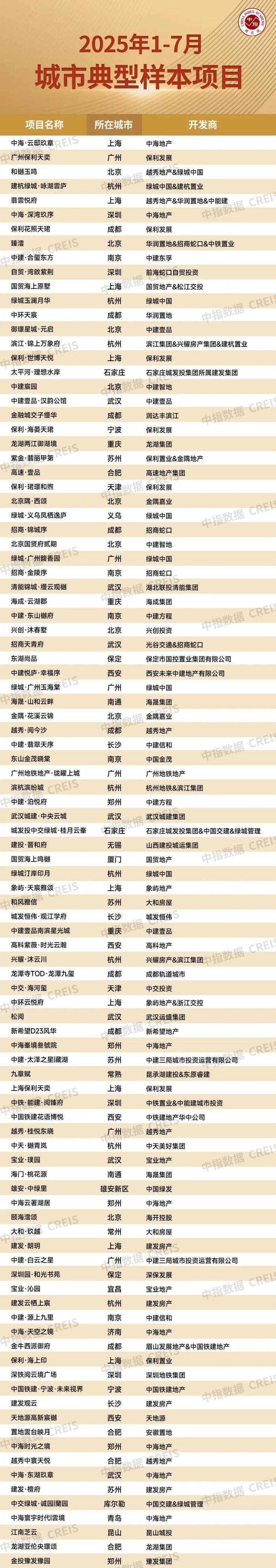 730政治局会议强调要“落实好中央城市工作会议精神,高质量开展城市更新”。未来针对城中村改造、“好房子”建设、优化土地供给等方面的相关政策有望持续推进。在此背景下,中指研究院在中房指数系统理论体系和架构的基础上,从百城价格指数样本项目中选取城市中有较强知名度和广泛影响力的典型样本项目,以“典型性”为基本原则,从销售表现、项目品质、品牌实力等维度出发,对主要城市样本项目进行研究,得出“2025年1-7月城市典型样本项目”,为行业提供标杆典范。