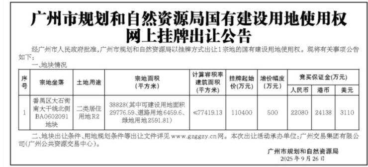据广州日报消息,广州将于近期挂牌番禺区大石街南大干线北侧BA0602091地块。
