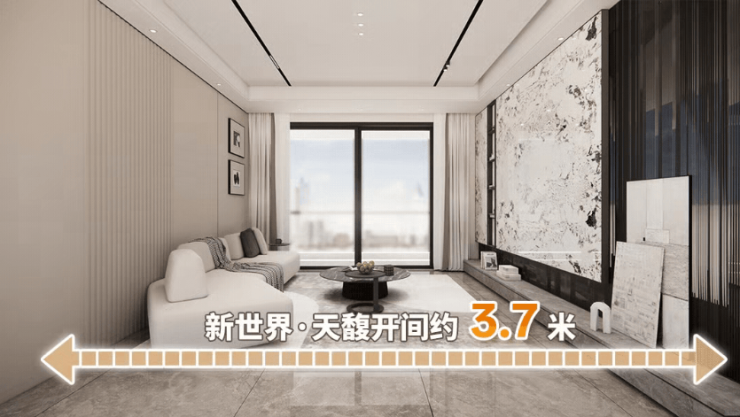 同等面积段的户型,其开间通常在约3.1-3.2米之间,而新世界·天馥的户型开间能做到约3.7米,摆放沙发茶几后,仍可开辟休闲区,无论是空间舒适度还是设计力都堪称降维打击。