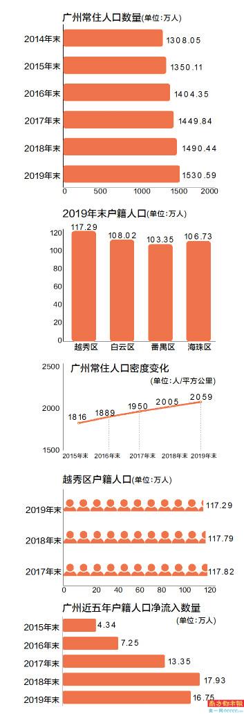 广州市统计局较新数据显示,2019年末,广州市常住人口1530.59万人,城镇化率为86.46%。年末户籍人口953.72万人,城镇化率为79.90%。广州作为国家重要的中心城市,均衡的产业发展和优质的公共服务吸引人才靠拢、集聚,广州连续5年常住人口年均增长超过40万人。与此同时,广东较新人口数据显示,2019年常住人口增加175万,人口增量位居全国前列,5年人口流入量800万,人口流入与广东经济排名前列大省的地位相称。