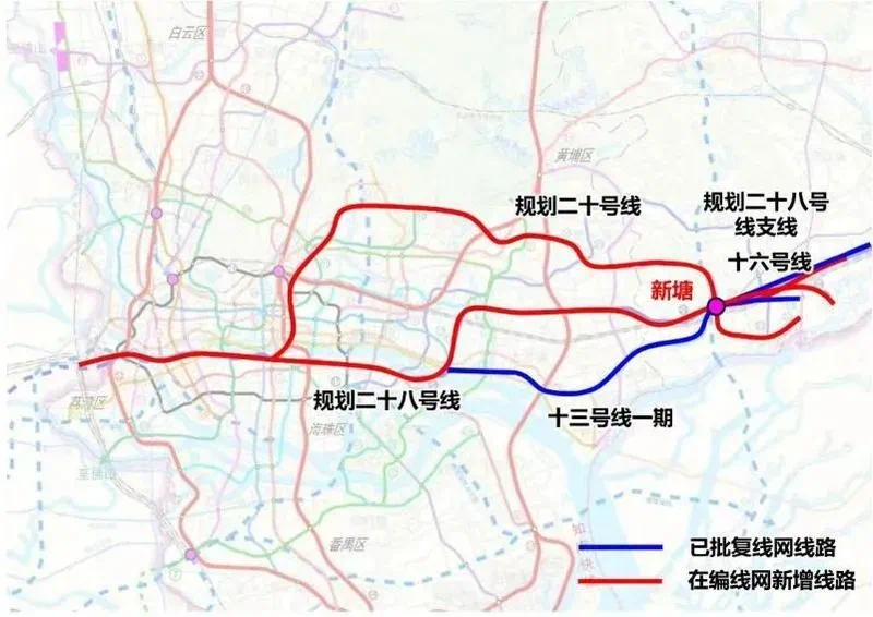 经过新洲站后,28号线将跨江在黄埔鱼珠设站,其后计划经过黄埔高铁站、新塘站,再跨江进入东莞,终于东莞新源路站。