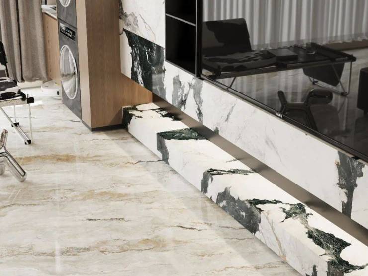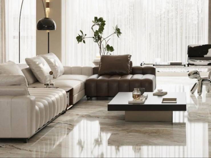 特点:这款瓷砖拥有逼真的大理石纹理,呈现出天然石材的丰富质感。其表面细腻的纹理和柔和的色调,能够很好地融入浅色调的意式轻奢风格中。