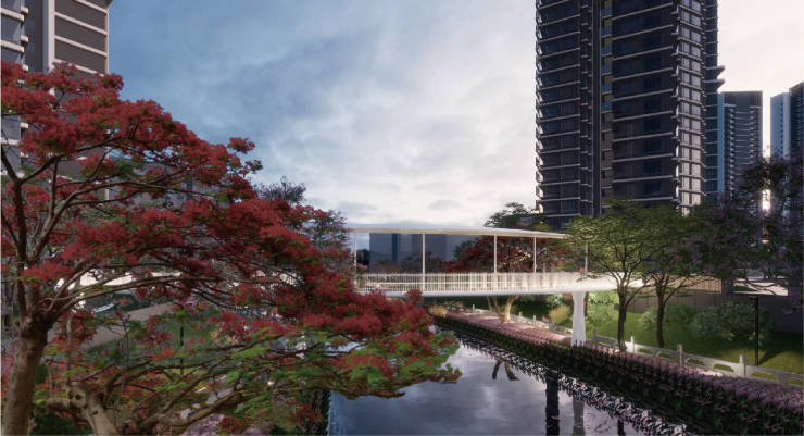 来宾可沿着缘溪入口步入,约 1.2KM 滨水长廊沿途设置半山驿站、明珠桥、音乐草坪等景观节点,串联起一幅灵动的山水画卷,聆听流水与自然之声。