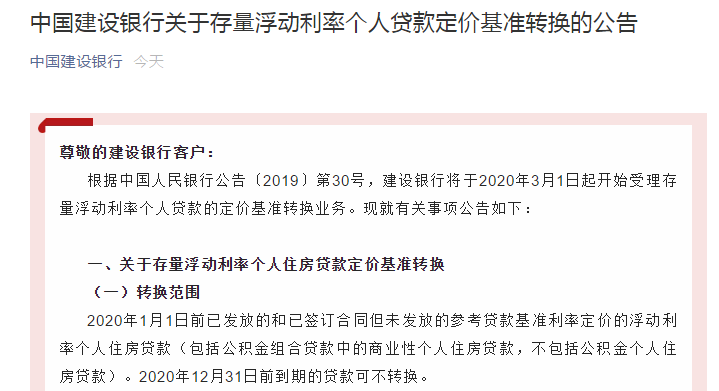 根据中国人民银行公告〔2019〕第30号,建设银行将于2020年3月1日起开始受理存量浮动利率个人贷款的定价基准转换业务。现就有关事项公告如下: