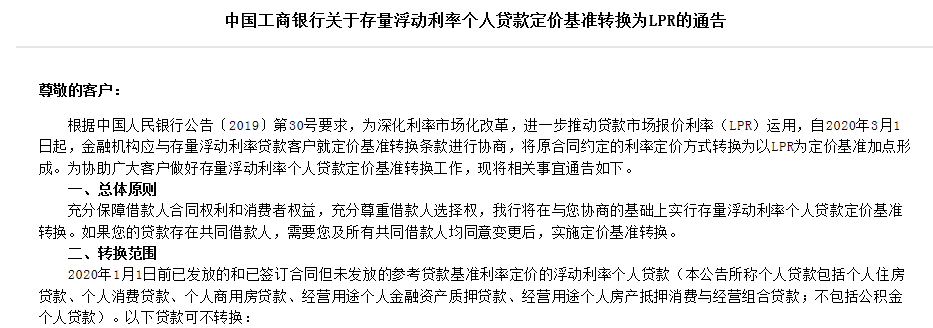 中国工商银行关于存量浮动利率个人贷款定价基准转换为LPR的通告
