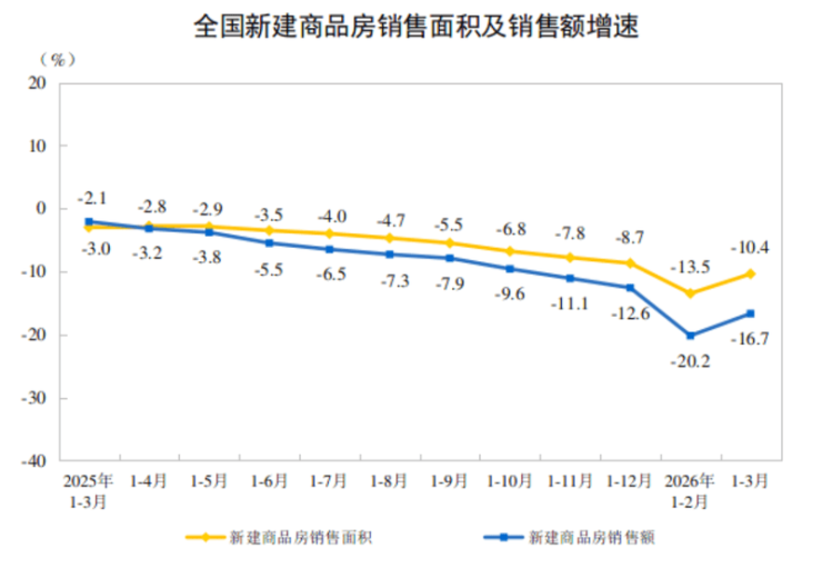 近日,国家统计局发布1-3月全国房地产开发投资与销售数据。一季度全国新建商品房销售面积为1.95亿平方米,同比下降10.4%,销售额1.73万亿元,同比下降16.7%,降幅较1-2月均有所收窄。