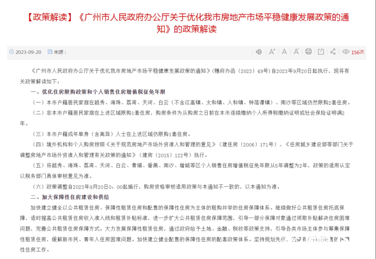 9月20日晚间,广州市人民政府办公厅发布《广州市人民政府办公厅关于优化我市房地产市场平稳健康发展政策的通知》。官方版政策解读也紧接着发布,并宣布自2023年9月20日起执行。