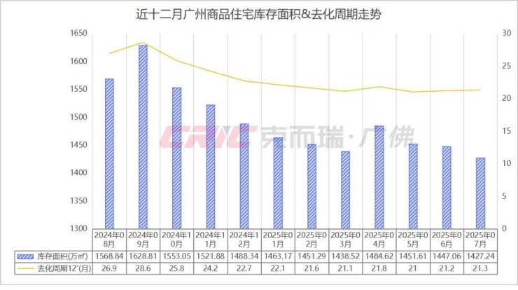 克而瑞数据监测显示,截至7月末广州商品住宅库存1427.24万㎡,较近一年最高位减少201.57万㎡,去化周期21.3个月,较近一年最高位减少7.3个月。