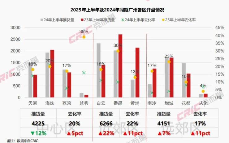 在开盘去化上,克而瑞数据监测显示,上半年中心四区、近郊三区市场改善明显,开盘去化率均在20%以上,而外围四区去化率仅有17%。