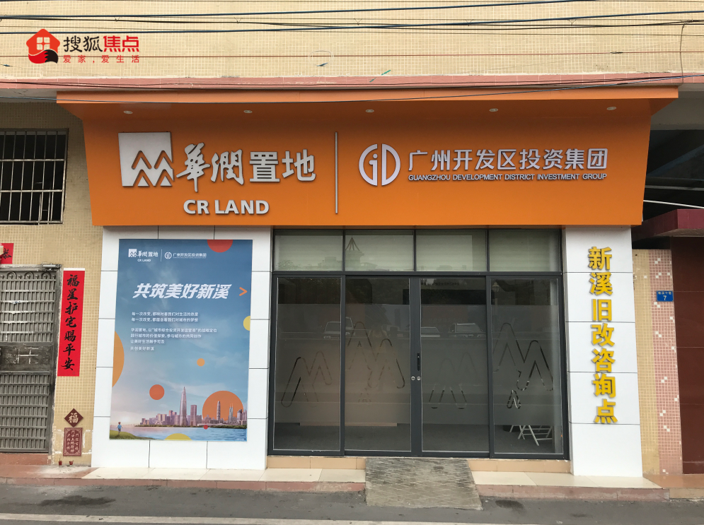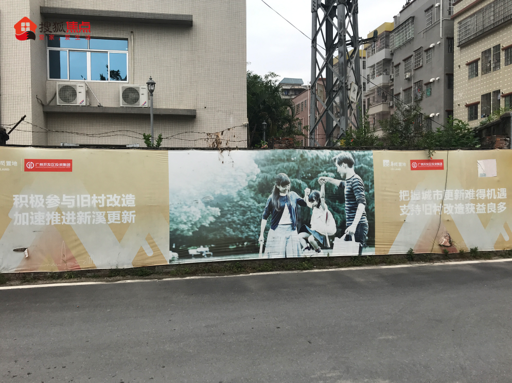 小狐君从大沙东C出口出来,步行一两分钟便看到大大“新溪”牌坊,在已褪色的国庆/中秋双节横幅上,还明显标着广州开发区投资集团、华润置地两大LOGO。