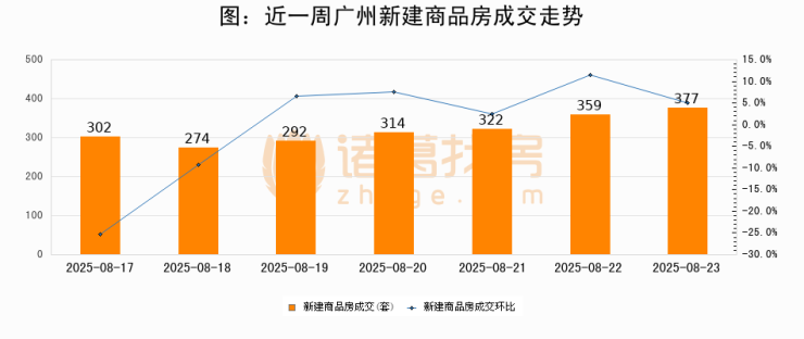 根据广州市住房和城乡建设局数据显示,2025年08月23日广州新建商品房成交377套,较昨日增加18套,环比上涨5%。近一周广州新建商品房日均成交320套。08月23日单日成交377套,高于近一周平均水平17.8%。