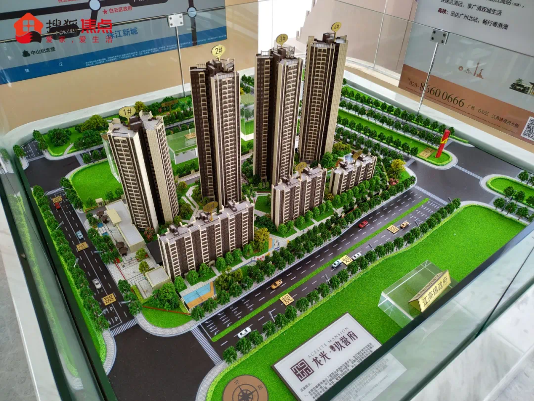 从现场的沙盘图可见,龙光住宅项目将建设7栋住宅,楼层高低有所不同,其中较高为32层,较低为7层。其中,1栋和5栋的1层规划建有商业。按照过往的开发产品来看,应该是属于临街商铺的产品规划。