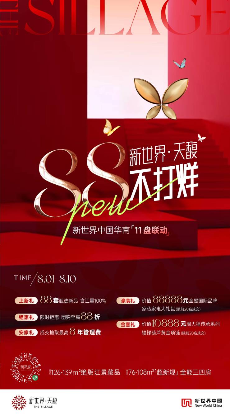近日,新世界中国华南11盘联动,热势盛启「88不打烊」专场,旗下白鹅潭人气红盘新世界·天馥率先发力,以五重钜惠礼遇引爆广州主城购房市场,提前拉开金九银十购房序幕。
