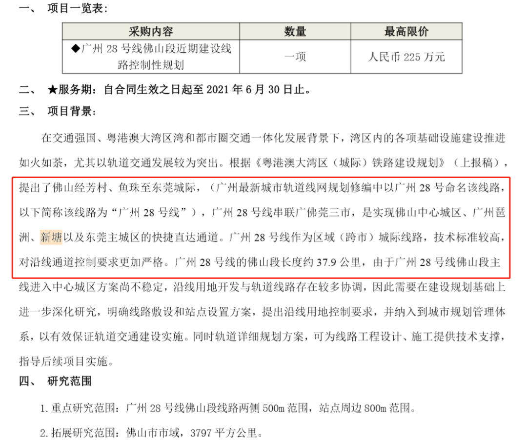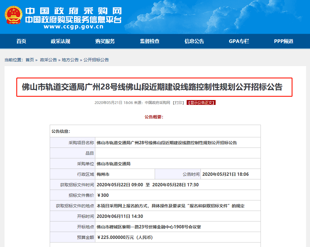 就在昨日,中国政府采购网上佛山市轨道交通局广州28号线佛山段近期建设线路控制性规划公开招标了。