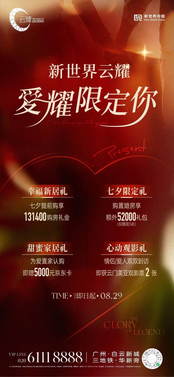 随着七夕佳节的临近,新世界云耀为这份“确定性”注入浪漫期许,特别推出「爱耀限定你」专属置业计划:限时赠送131400元购房礼金抵扣房款,诠释“一生一世”的承诺;并为前5对认购新人准备52000元家居升级基金,为新家甜蜜加码。还有更多甜蜜好礼,可亲自到访解锁,幸福安家。