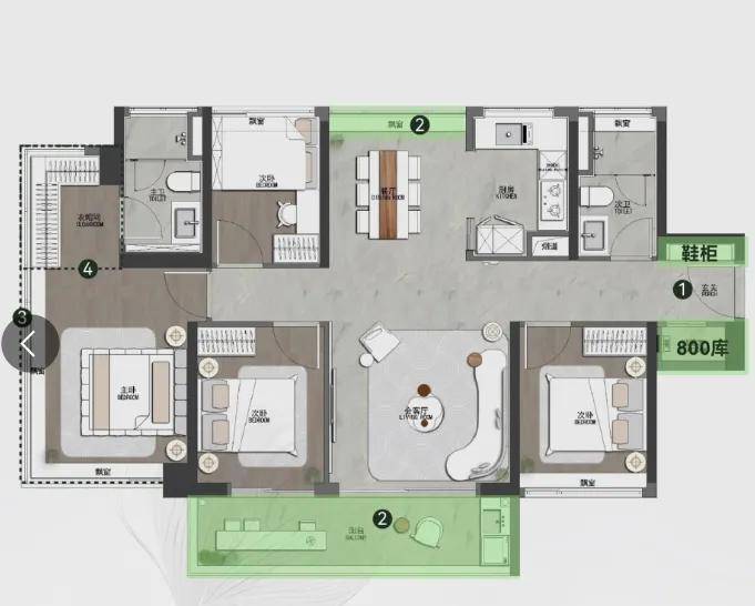 绿城馥香园107㎡户型,采用“四叶草”户型设计,四开间朝南,南向次卧可直通阳台,还能实现双洄游动线,在户型玄关处配备了800库收纳和鞋柜,提升了空间利用率,兼顾使用与美观。