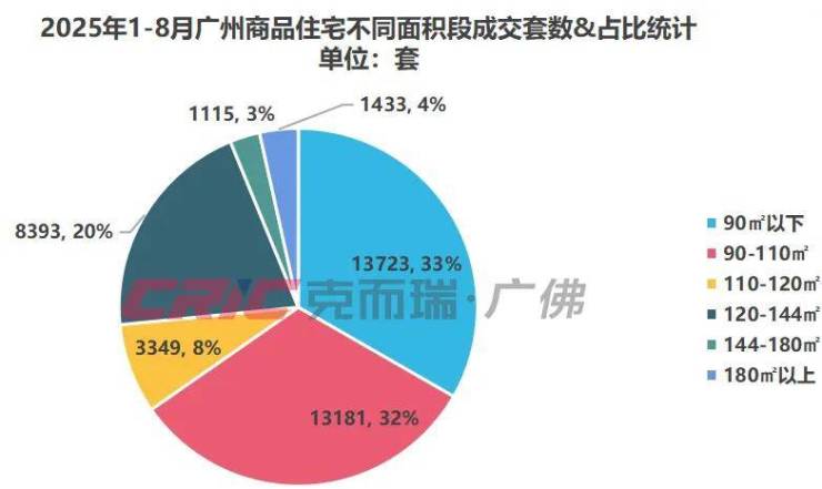 克而瑞数据监测显示,2025年1-8月广州新房市场中,三房最为热销,共成交20075套,占比50%,四房及以上房型成交18407套,占比46%,较去年同时期扩大5%。