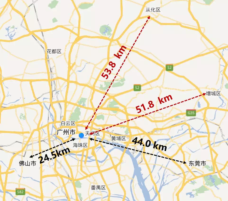 由于交通问题,这两个行政区与广州市区联系十分不紧密。以从化举例,从化街口中心区与天河、越秀核心区域之间的直线距离均在50公里以上,坐大巴也需要2个小时以上。佛山和东莞甚至都要比增城从化更近广州,而且这两个城市都很早与广州实现轨道交通链接,基本实现半小时生活圈。