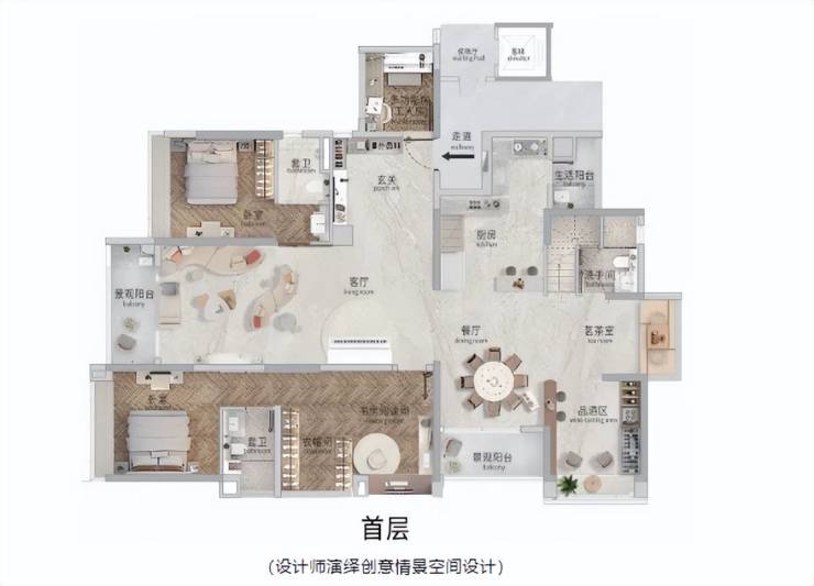 首层专设了品酒区,茗茶室,最亮眼的是主人房一拖三,含括书房阅读间和衣帽间及主卫。该户型产品傲踞顶层,远可对望琶洲珠江新城金融城,近可左揽长隆右揽万博,尽享城市发展C位。