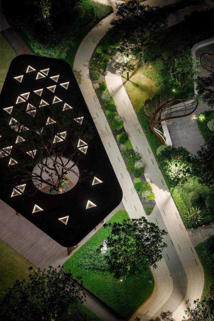 园林整体使用现代风格设计语言,在植物的甄选与搭配上,朴树、红果冬青、黄皮、大腹木棉、澳洲火焰木、红花风铃木等多种名贵树种交错栽植,更显“四季有景”的巧思。林下休憩桌椅为邻里交流提供了静谧场所,中央草坪成为家庭聚会与儿童嬉戏的天然场地,蜿蜒的花园小径让散步成为每日享受,精致的叠水景观则在视觉与听觉上增添灵动趣味。每一处景观配套都经过精心设计,让园林真正融入业主的日常生活。