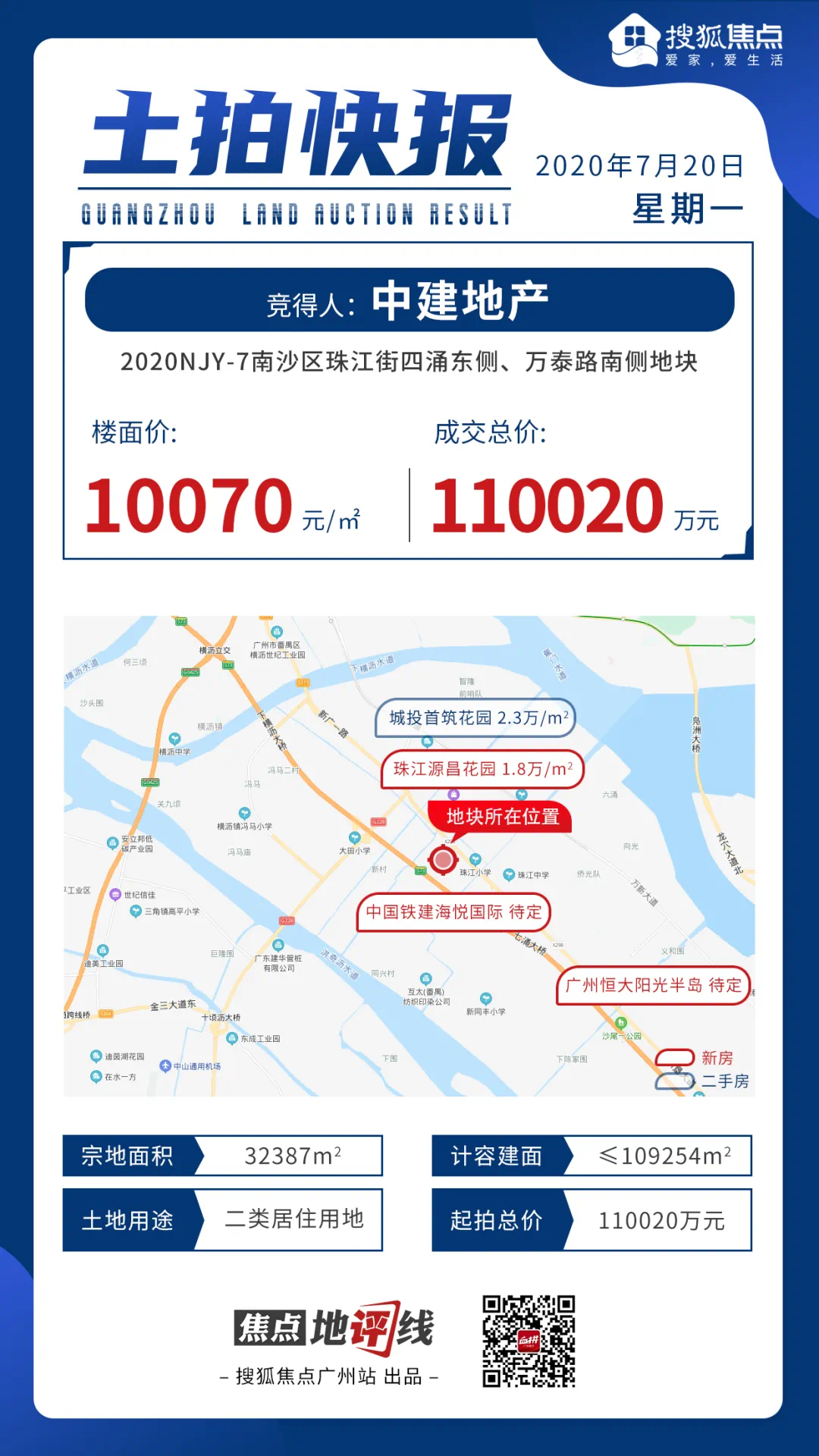 北京中建地产有限责任公司以总价110020万元拿下 2020NJY-7南沙区珠江街四涌东侧、万泰路南侧地块,折合楼面价10070元/㎡。