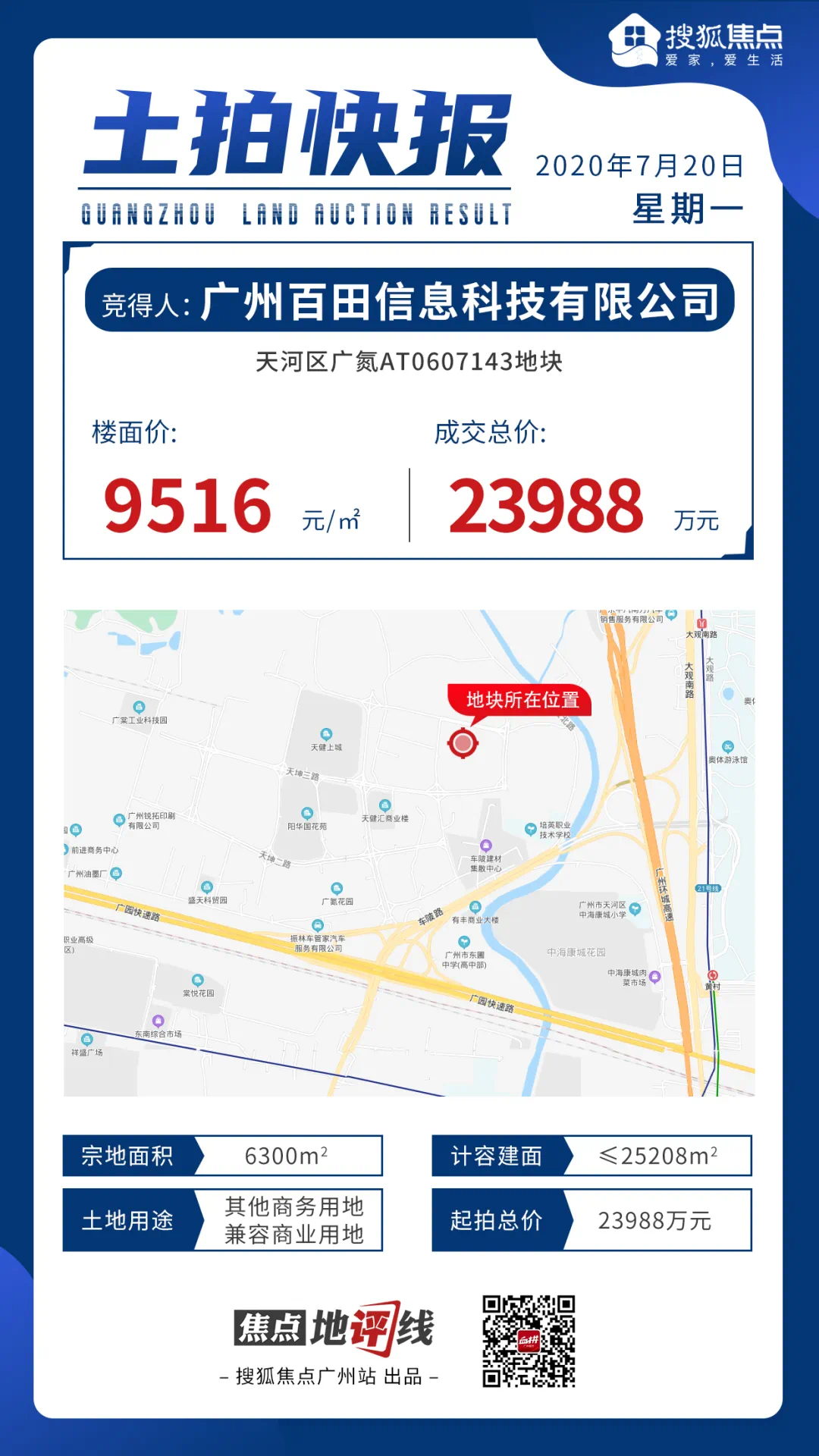 广州百田信息科技有限公司以总价23988万元拿下天河区广氮AT0607143地块,折合楼面价9516元/㎡。