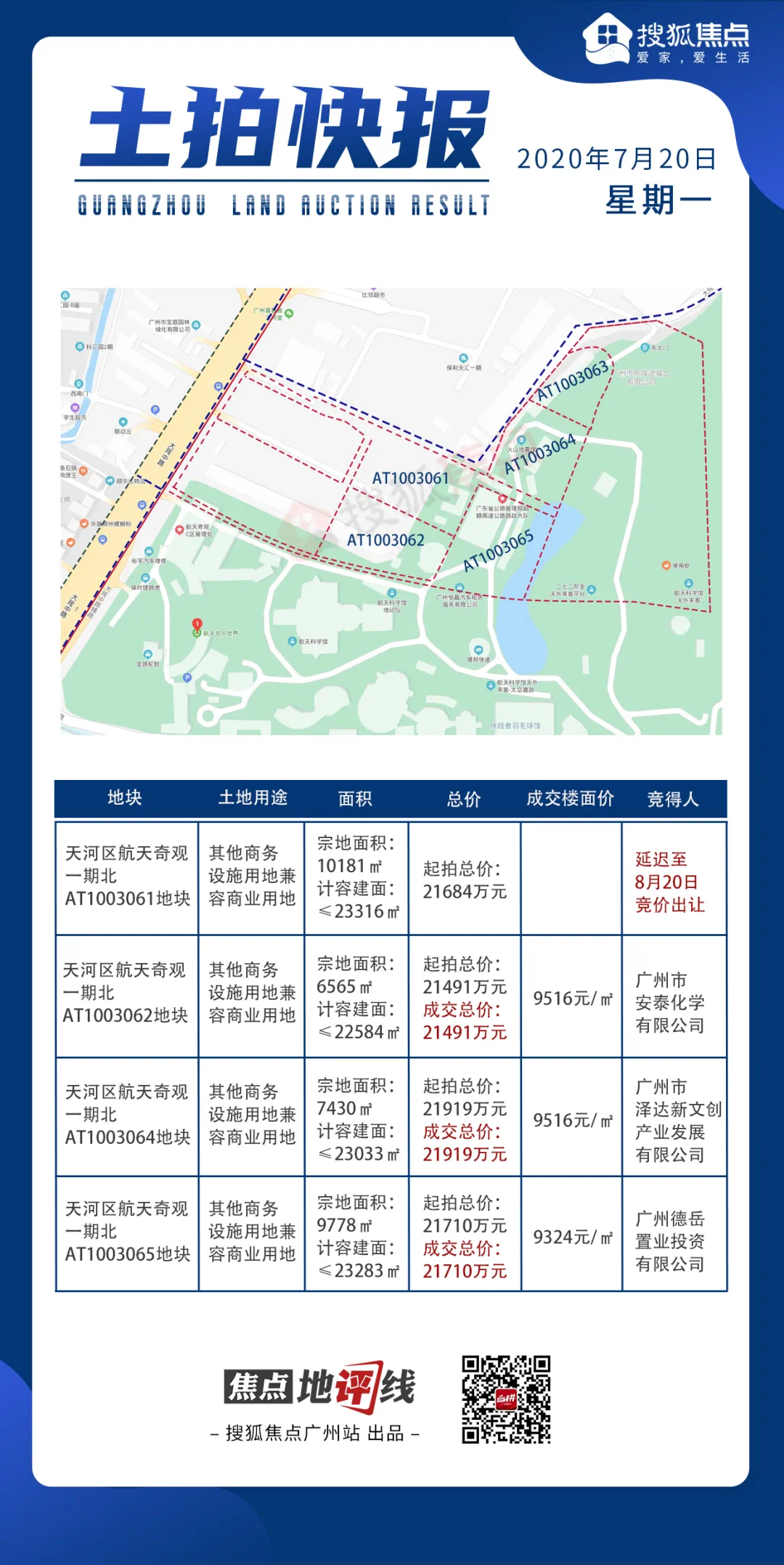 广州市安泰化学有限公司以总价21491万元拿下天河区航天奇观一期北AT1003062地块,折合楼面价9516元/㎡。