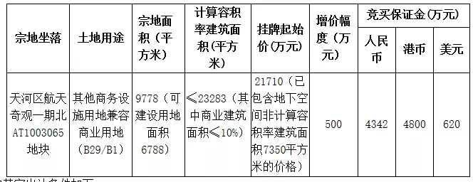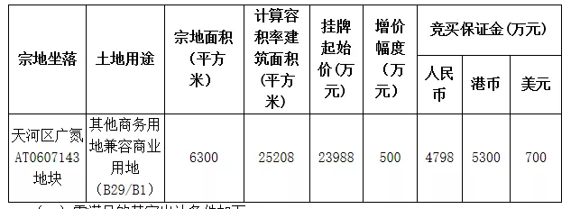 除位于航天奇观的4宗商地外,今日,天河还成功出让天河区广氮一商地。该地块用途为其他商务用地兼容商业用地,挂牌起始价23988万元,折合楼面价9516元/㎡。