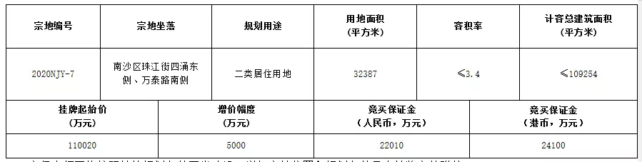 2020NJY-7南沙区珠江街四涌东侧、万泰路南侧地块,土地用途为二类居住用地,用地面积32387㎡,计容面积109254㎡,起拍价110020万元,楼面价10070元/㎡。