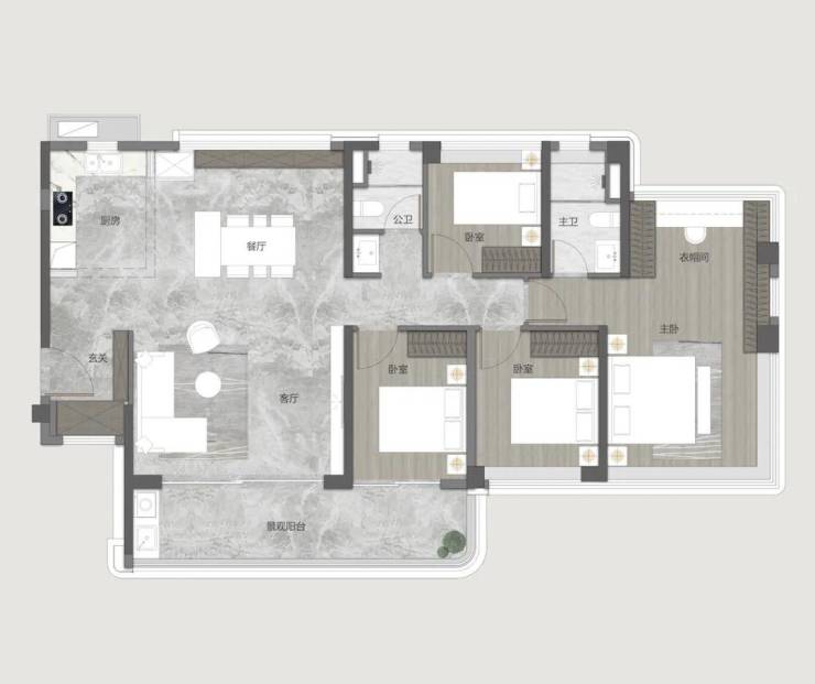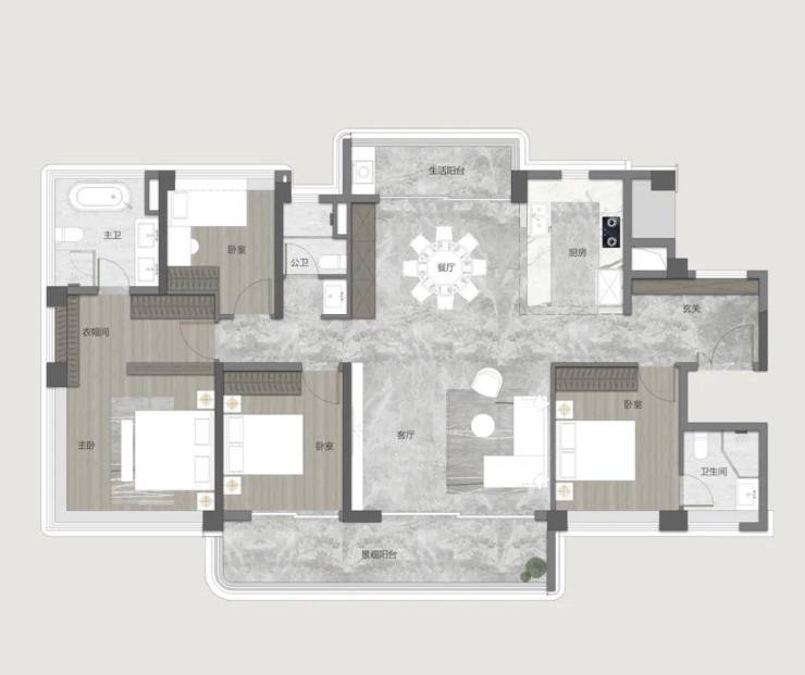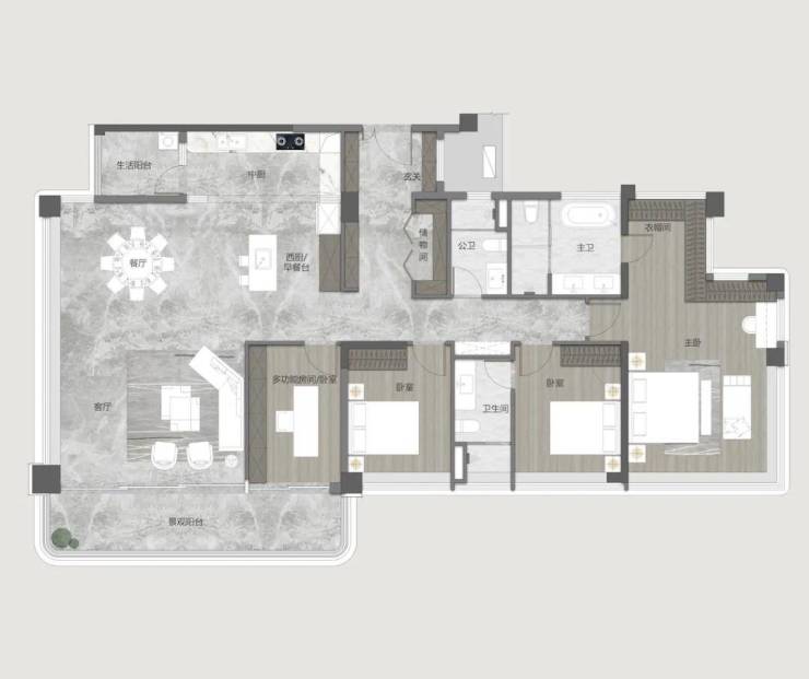 此外,该户型富有灵活性,公共区域可与相邻空间依需打通,卧室亦可灵活调整为双套房或整合为大套间。尤其是为多孩家庭设计的“灵动双子套房”,既守护彼此的私密天地,又让父母的照看近在咫尺,让亲密与独立温情共存。
